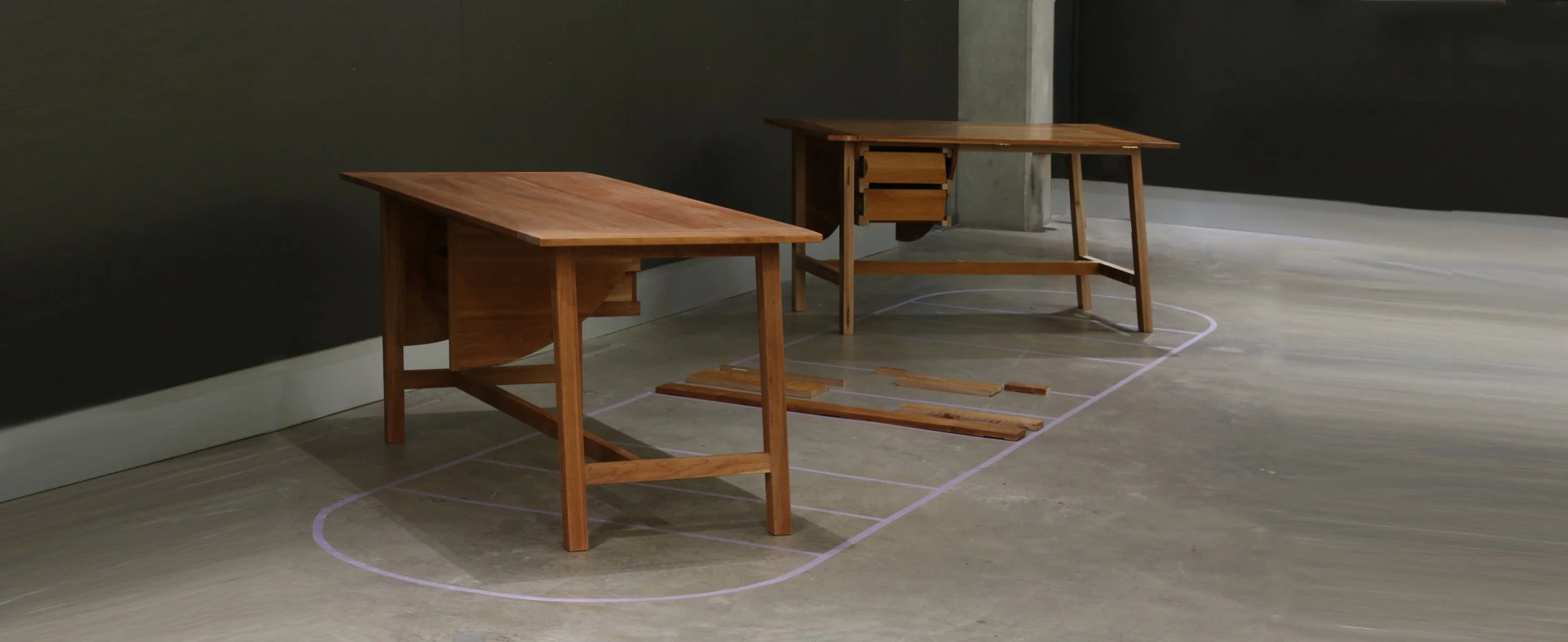 In the twenty-first century, the meeting room has moved to a singular workstation; from in-person to online. This body of work was inspired by a key principle of sustainable design: to reuse and reduce waste. The large boardroom table, now broken, unwanted and discarded, has found new life in these two desks. Almost every piece has been used.